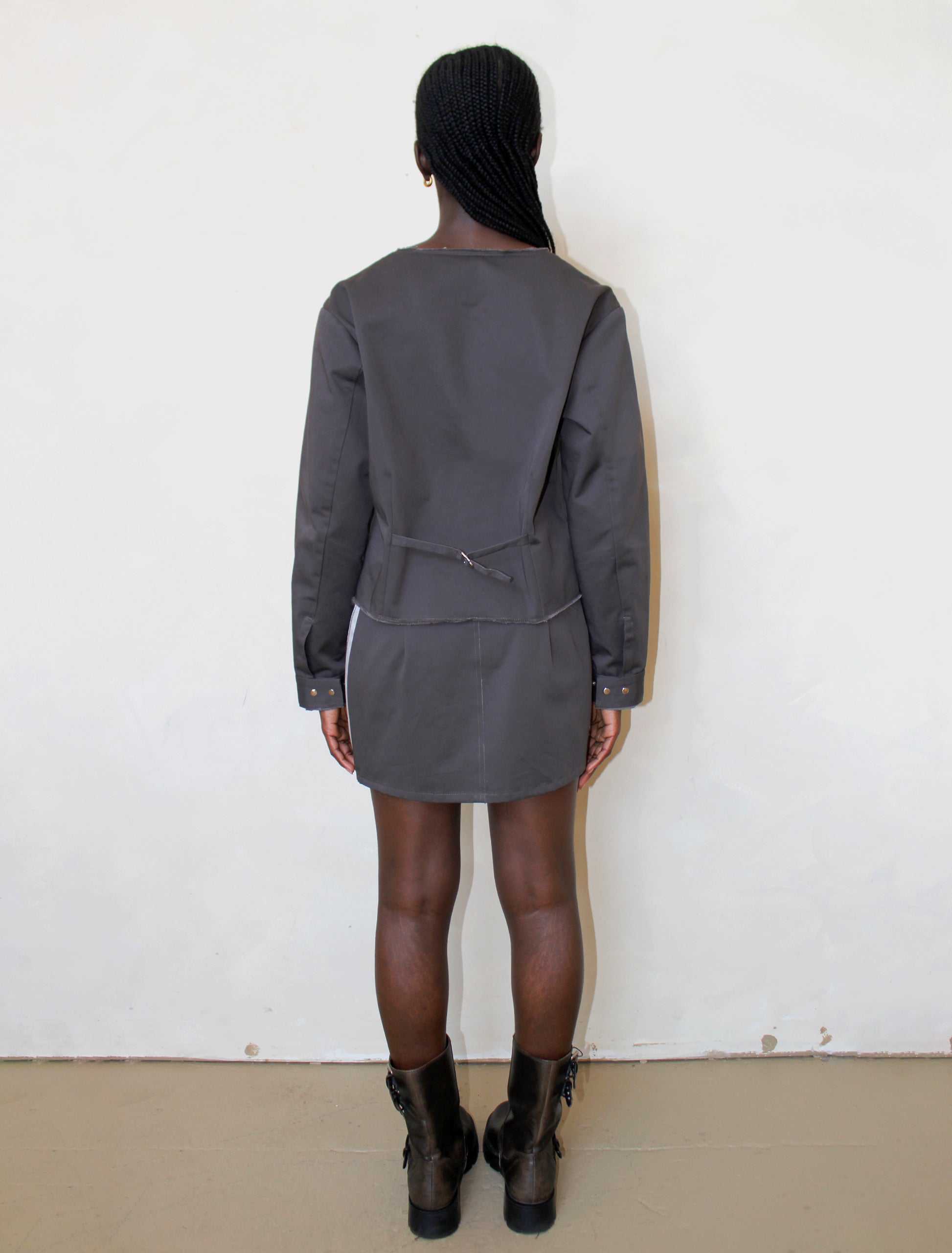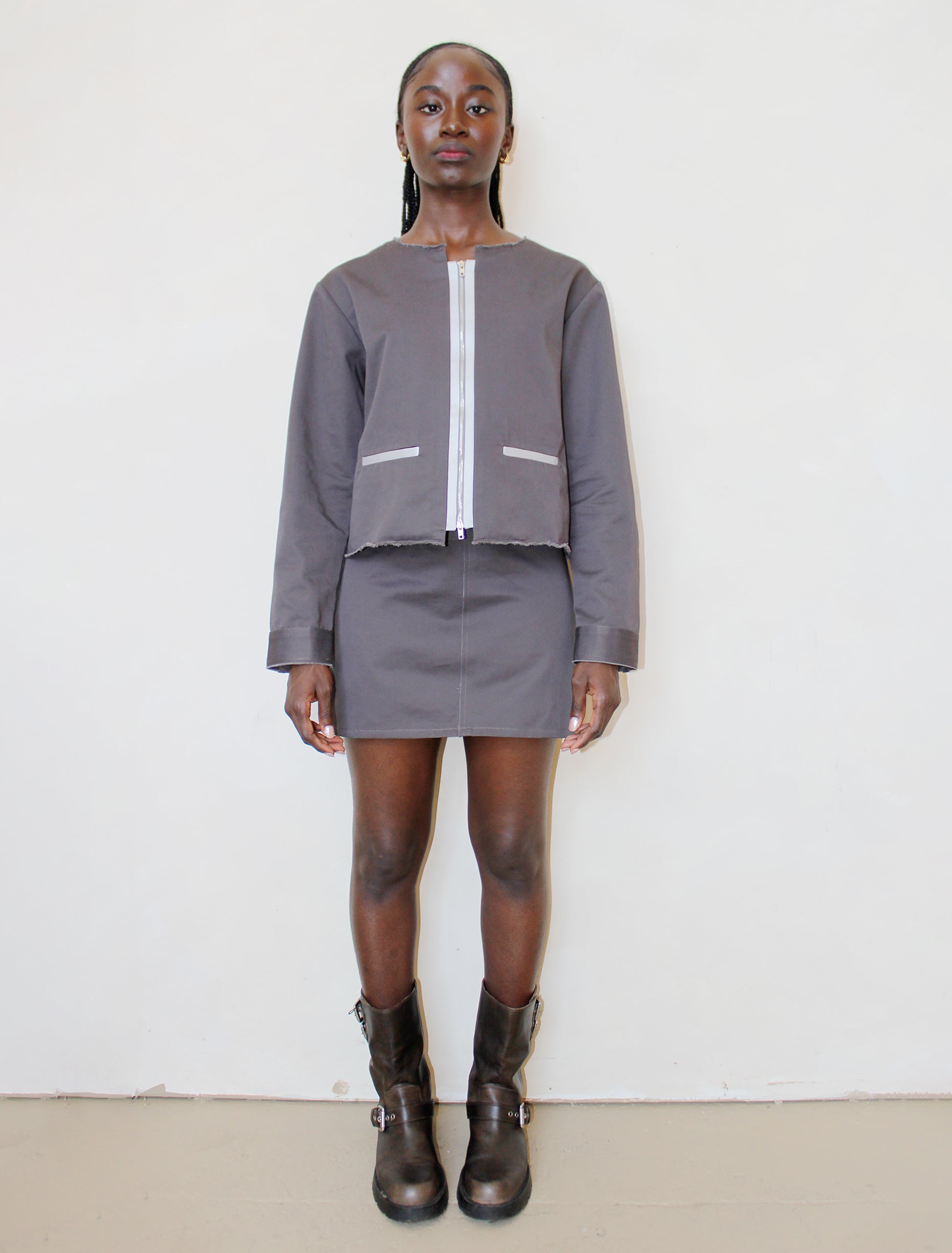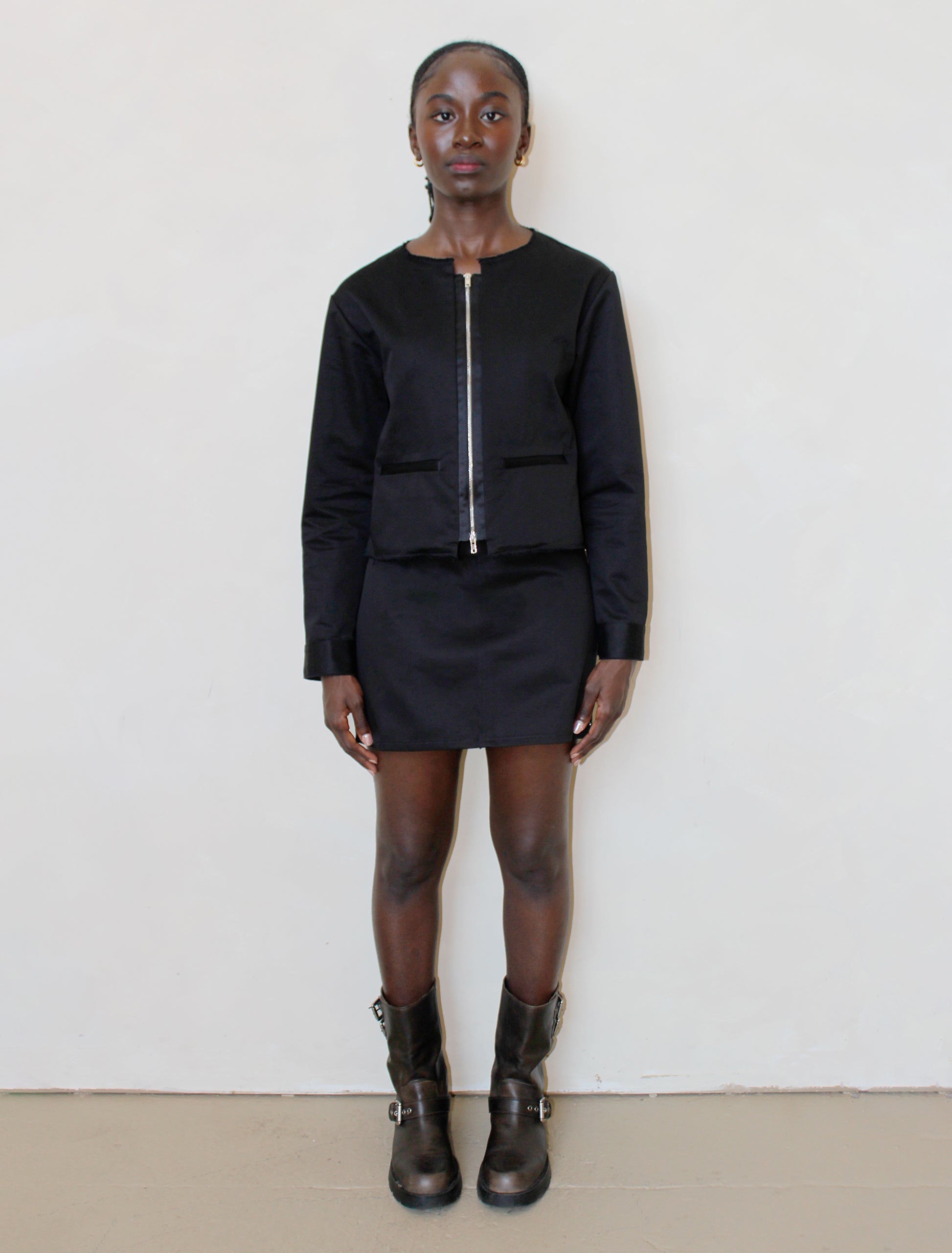 The Carbon jacket is a perfect mixture of elevated and sleek details with rugged finishes. It features a shortened and exposed zipper enclosure with satin placket detail. It has a raw-edge neckline, front pockets, and metal slide adjuster in the back. The silhouette is slightly oversized and cropped for a modern everyday look.