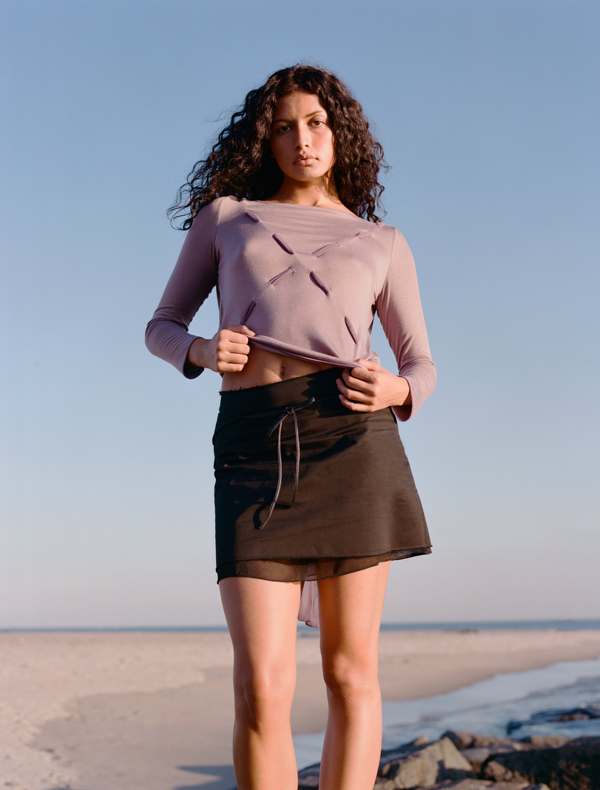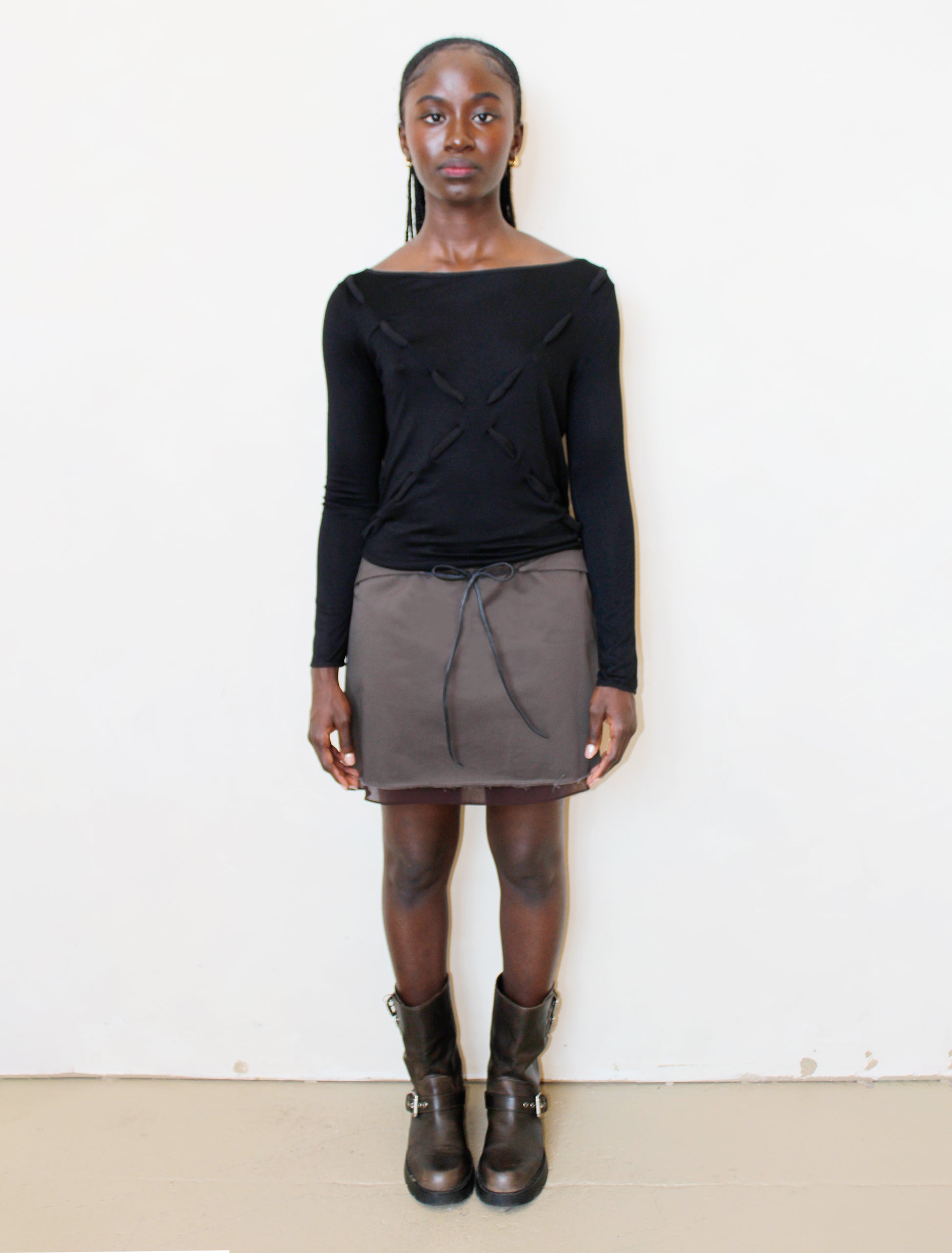 The Crux top is a long sleeve jersey knit top featuring an open back enclosed with chiffon ties for a soft and sensual look. It sits with a slight drape to the body for a slightly fitted yet comfortable finish. It features two rows of chiffon that are woven diagonally across the front to meet again in the back.