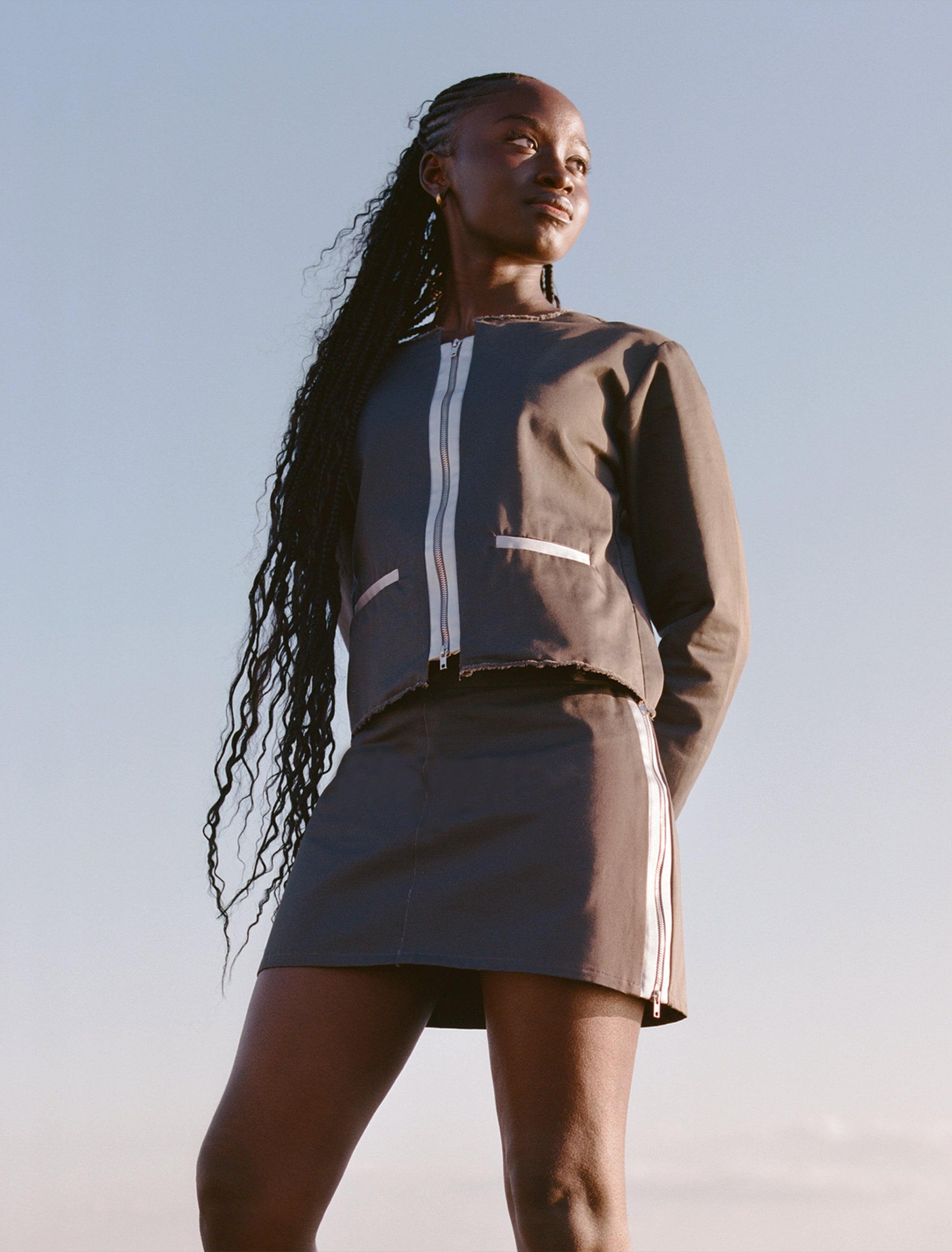 The Paradise skirt is a micro skirt with an exposed zipper and satin placket detail. The skirt features a two-way zipper so you can wear it at its full length or at a micro-micro length. It also features a raw edge seam detail down the center front and back.